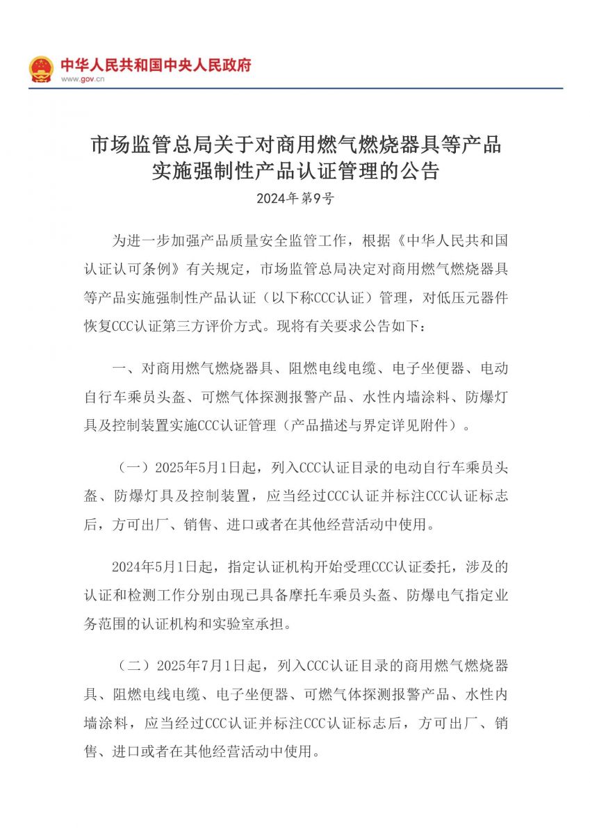 國家市場監管總局要求自2025年5月起對可燃氣體報警裝置實施強制性CCC認證