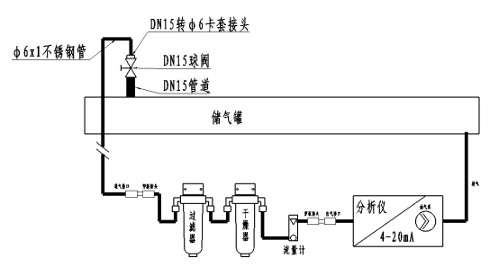 如(圖一)現場工藝管道的直徑為DN100,施工時在取樣點處焊接安裝一個DN15的球閥(供方提供),再安裝一個DN15轉Ф6卡套的接頭(供方提供),連接管路采用Ф6×1內壁光滑的不銹鋼管(供方提供兩根2.5米的不銹鋼管),以減小采樣的滯后和施工難度。