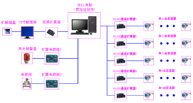 備注: 系統每個回路最大容量可控制1040只可燃、毒性氣體變送器,5個RS485通信擴展器一共可安裝160臺變送器,以備后續增加用擴展電路板2和電磁閥為備用.
